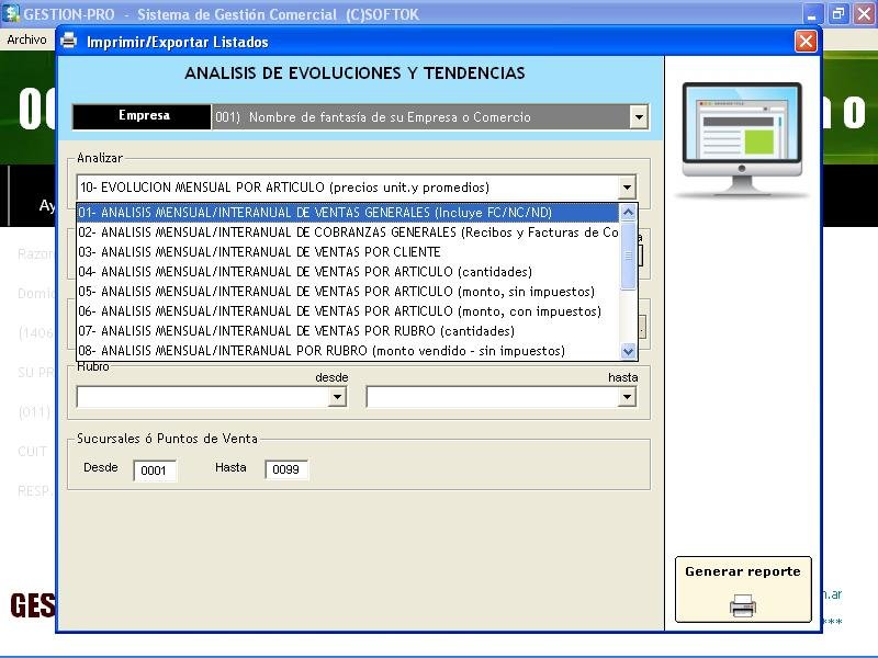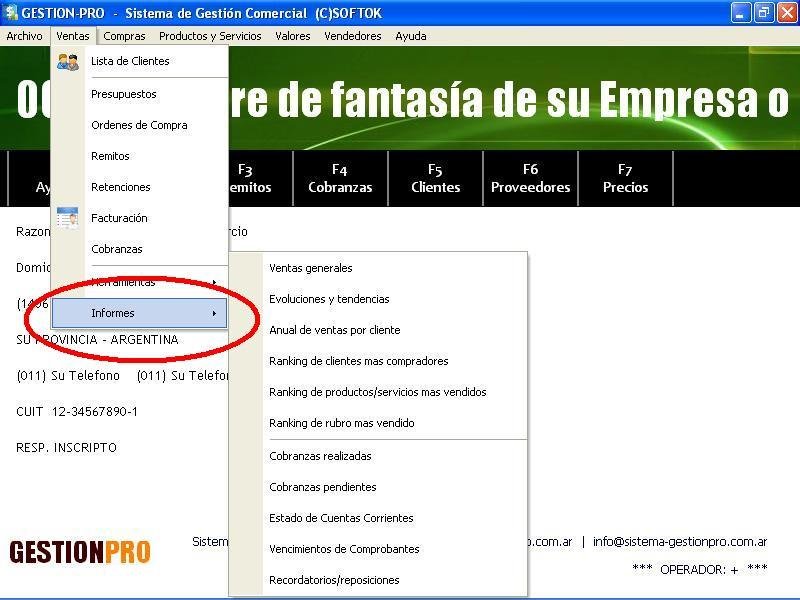 Informes de Ventas, cobranzas y Cuentas Corrientes. Ranking de Clientes, artículos más vendidos, Rubros de Mercadería y Vendedores. Movimientos de Valores en el día y entre fechas. Cheques recibidos y cheques pasados entre fechas. Listas de Clientes y etiquetas de Correo. Listas de precios y existencias faltantes. Historiales de Compras, Ventas y movimientos de mercadería (resúmenes y detalles).