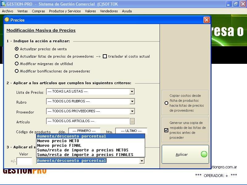 Ventas de Bienes y Servicios. Control automático de existencias. Múltiples depósitos. Mercadería con Nro. de Serie. Productos de compraventa y productos de elaboración propia, con fórmula de elaboración. Múltiples Listas de Precios, con capacidad bi-monetaria (Pesos y Dólares).